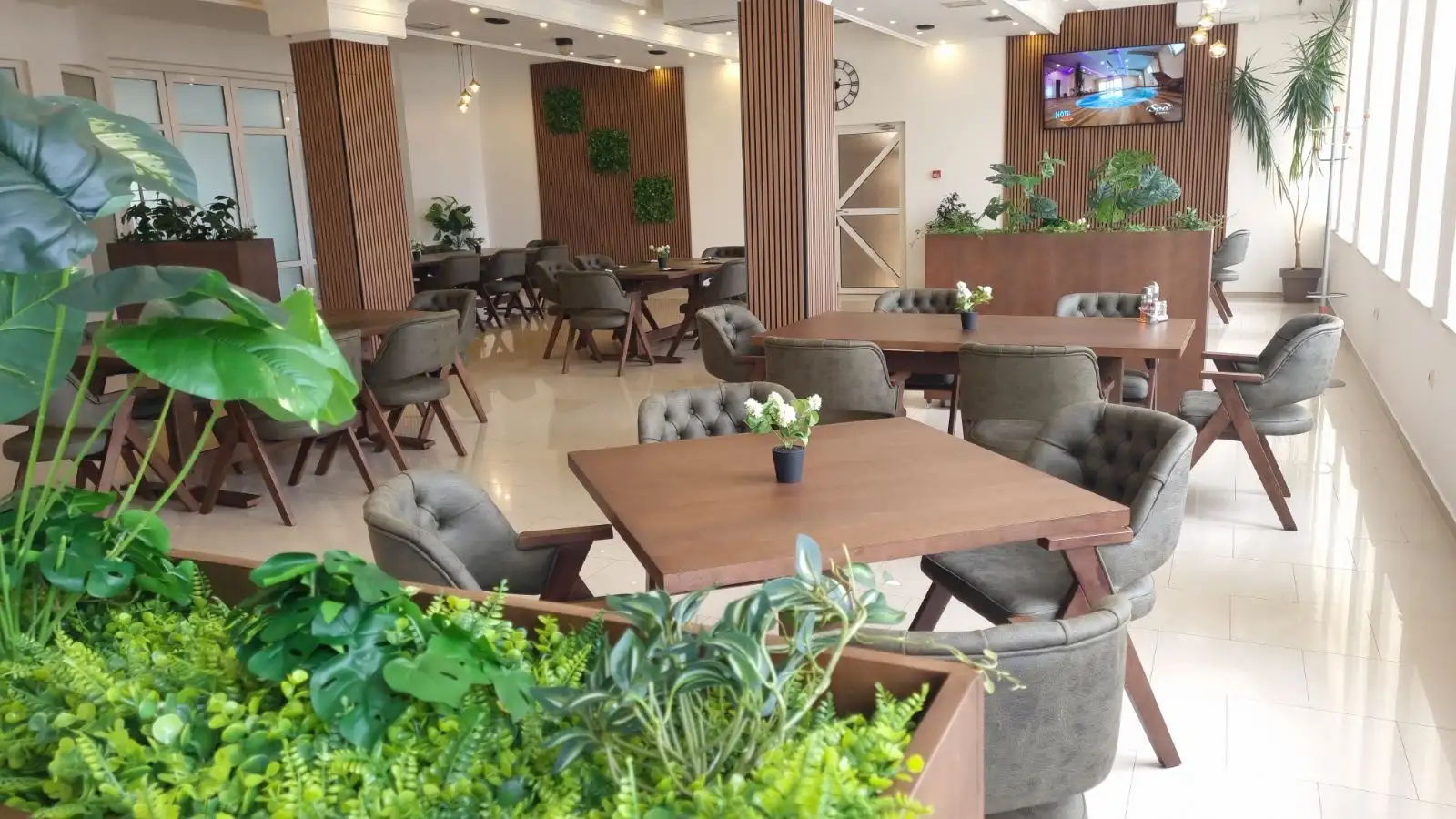 U ovom restoranu isporučili smo kompletan nameštaj – masivne drvene stolove, udobne tapacirane stolice i dekorativne pregrade sa biljkama koje stvaraju toplu atmosferu u kojoj se gosti osećaju prijatno i opušteno.
